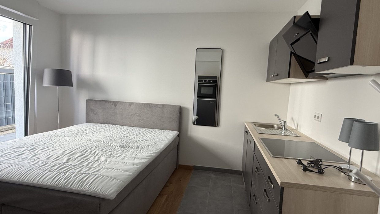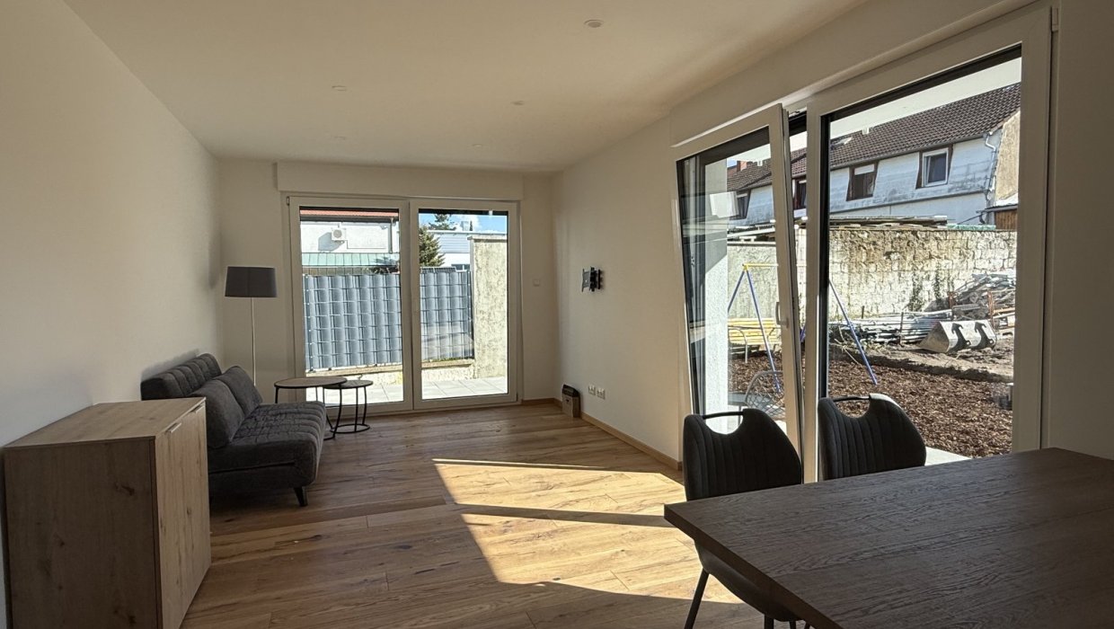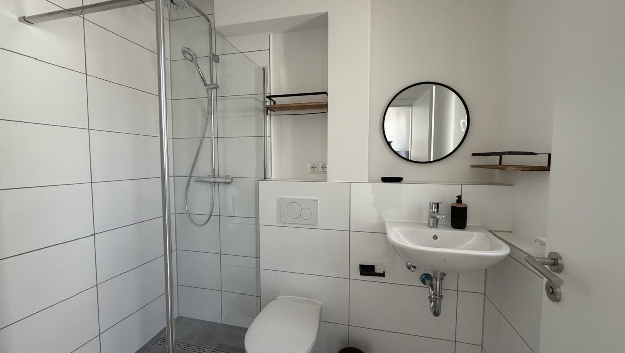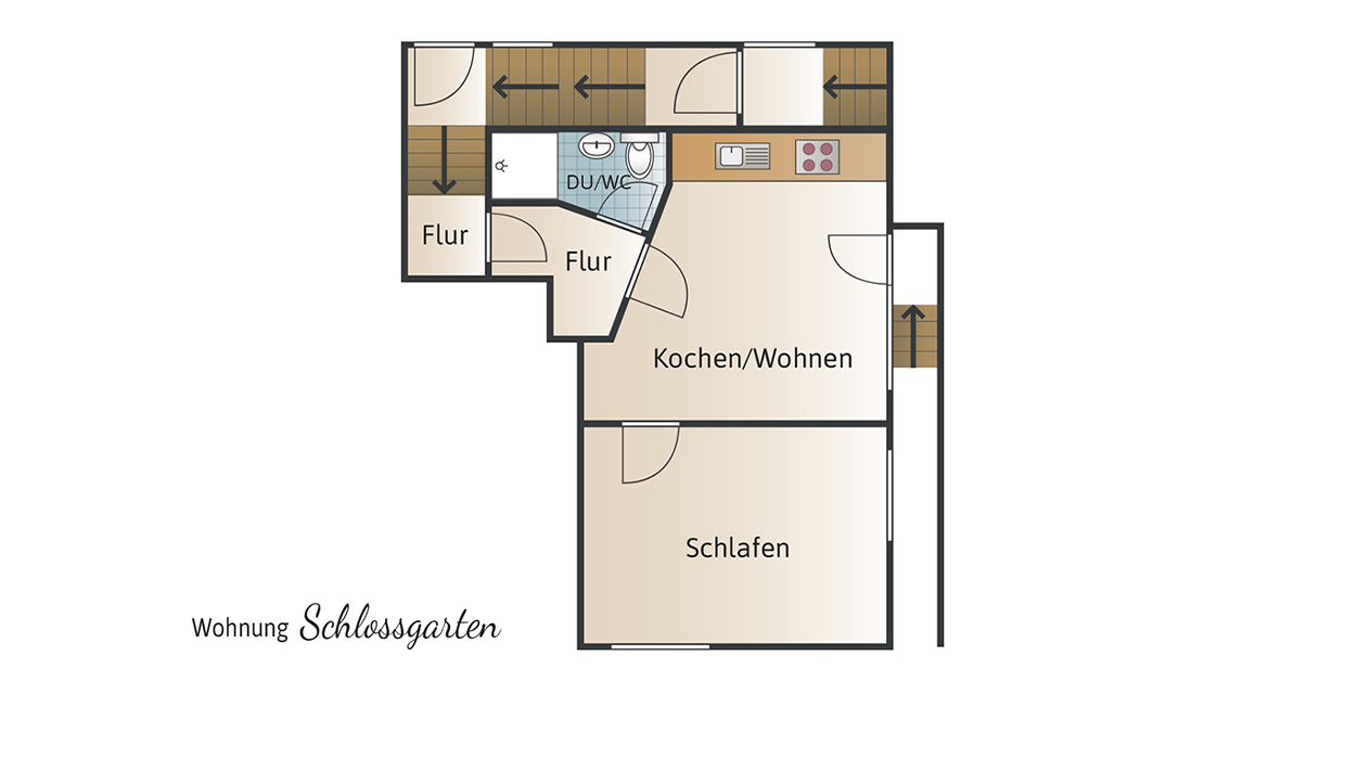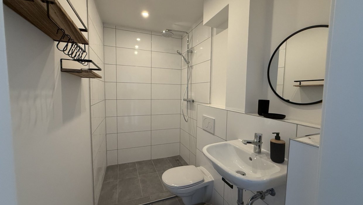Die 40-qm-Ferienwohnung Schlossgarten im Erdgeschoss überzeugt durch einen hellen, modernen Zuschnitt und eine gemütliche Atmosphäre. Sie verfügt über ein separates Schlafzimmer mit komfortablem Boxspringbett und großzügigem Schrank. Der Wohnbereich kombiniert Küche, Essplatz und Sofa zu einem harmonischen Raum, der sowohl zum Entspannen als auch zum Kochen einlädt. Die Küche ist vollständig ausgestattet und ideal für längere Aufenthalte. Das Tageslichtbad bietet eine ebenerdige Dusche und hochwertige Ausstattung. Die angrenzende Terrasse erweitert den Wohnraum nach draußen und lädt zum Verweilen ein. Ein Fernseher sorgt für Unterhaltung. Die Wohnung eignet sich perfekt für 1–2 Personen, die Komfort und Ruhe schätzen.