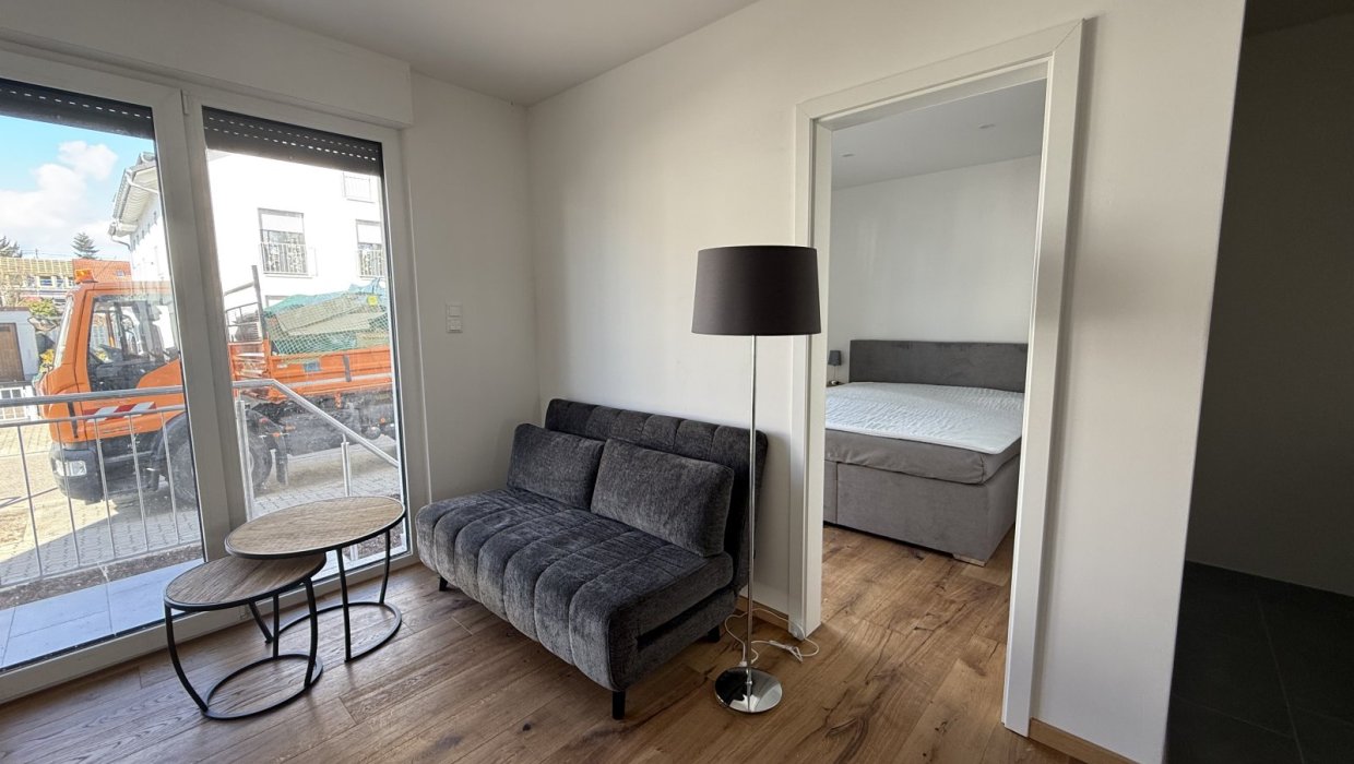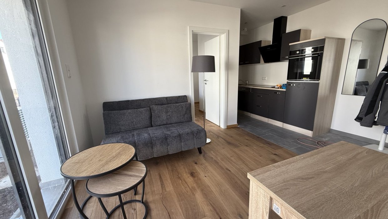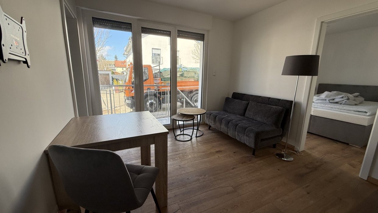 Die 40-qm-Wohnung Schlossgarten im EG bietet ein Schlafzimmer mit Boxspringbett, einen Wohnbereich mit Küche, Sofa und Esstisch sowie ein Tageslichtbad mit ebenerdiger Dusche. Mit Terrasse und TV ideal für 1–2 Personen.